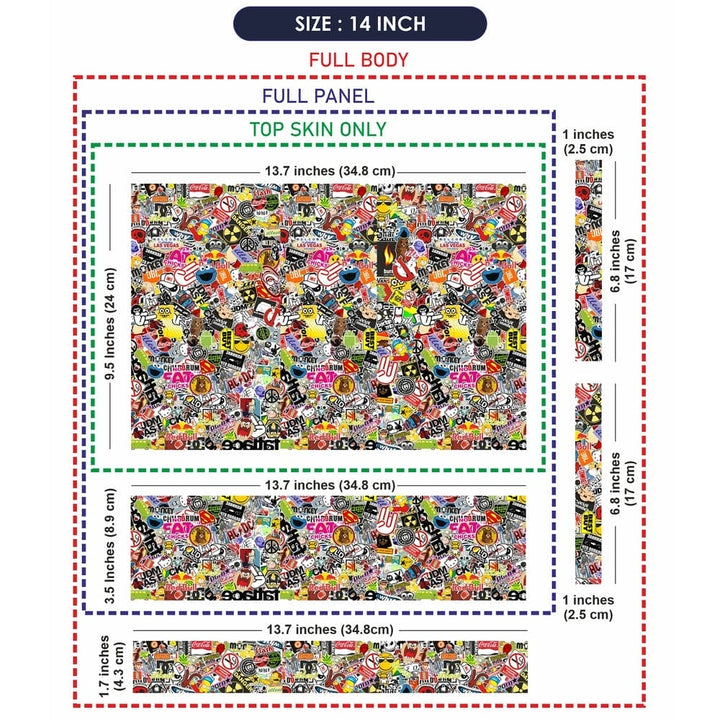 • Full Body: Full Body laptop skins offer comprehensive coverage that extends beyond the top panel and includes the entire area around the keyboard, including the palmrest. These skins provide all-around protection while maintaining the aesthetic appeal of your device.
