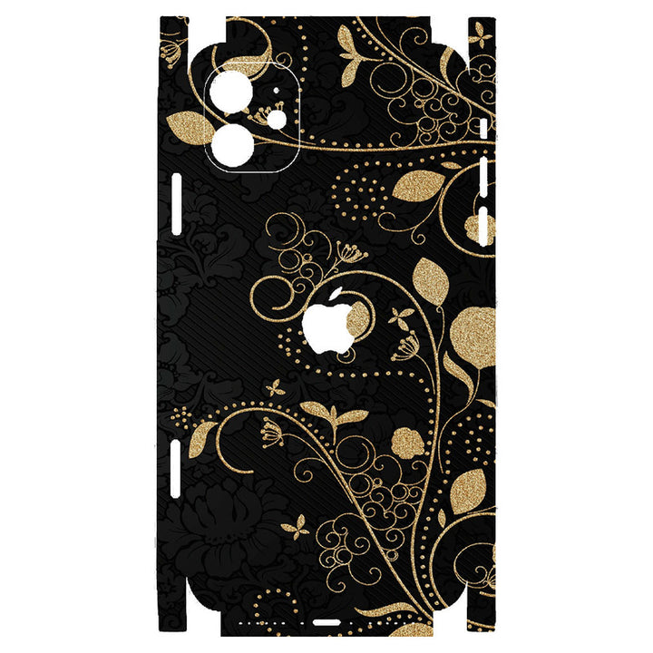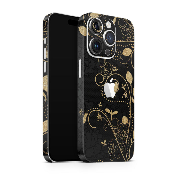 3D Embossed Skin Wrap for Apple iPhone - Golden Floral Leaves on Black