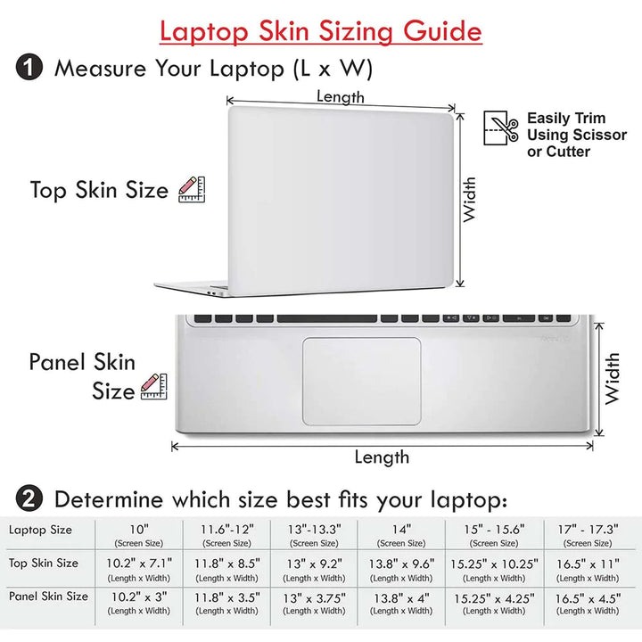 - Laptop Skin Dimension (WxH): Please reference the SIZING GUIDE to determine the best fit.