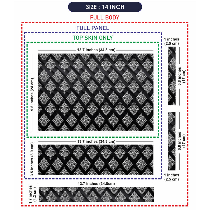 • Full Body: Full Body laptop skins offer comprehensive coverage that extends beyond the top panel and includes the entire area around the keyboard, including the palmrest. These skins provide all-around protection while maintaining the aesthetic appeal of your device.