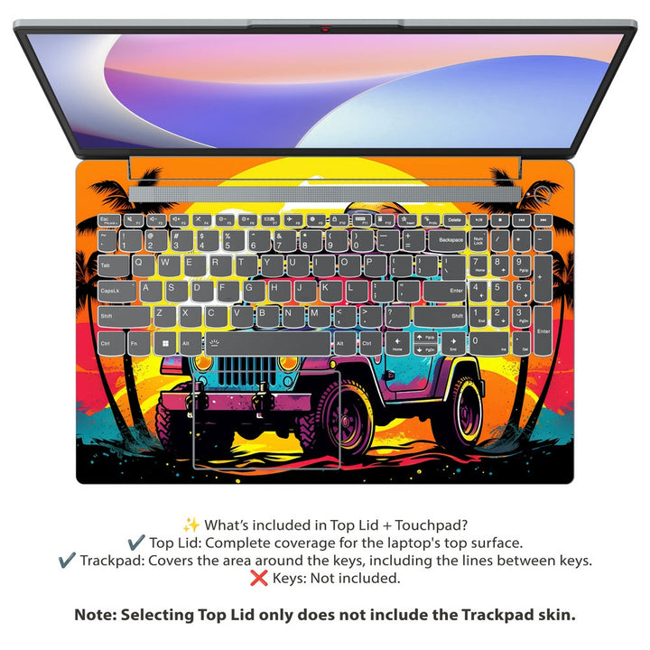 - Superior Protection: The Retro Beach Jeep skin shields the top panel of your Lenovo laptop, keeping it safe from everyday damage while maintaining a sleek appearance.