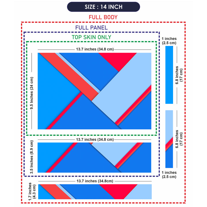 - Full Panel: Full Panel laptop skins provide coverage for the top panel and palmrest area, protecting the most visible parts of your laptop while adding a touch of style and personalization.