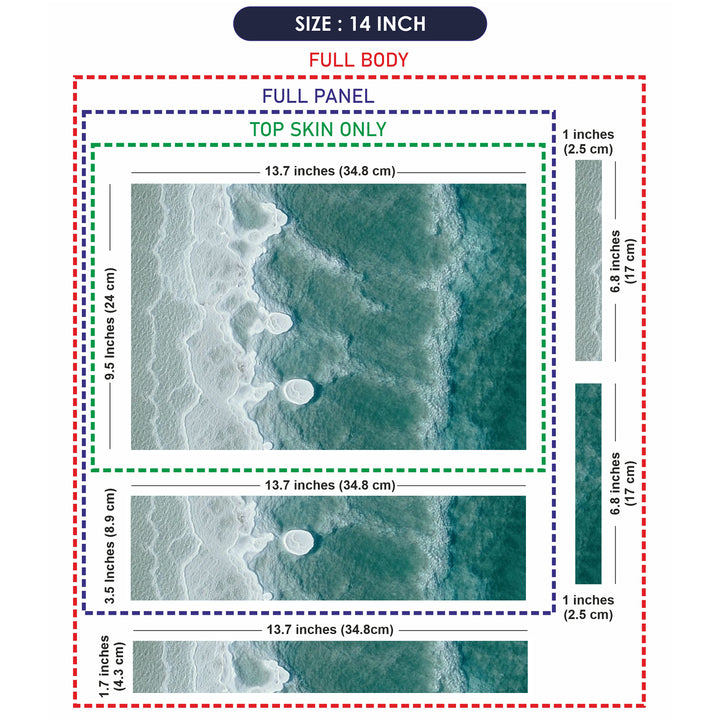 - Full Body: Full Body laptop skins offer comprehensive coverage that extends beyond the top panel and includes the entire area around the keyboard, including the palmrest. These skins provide all-around protection while maintaining the aesthetic appeal of your device.